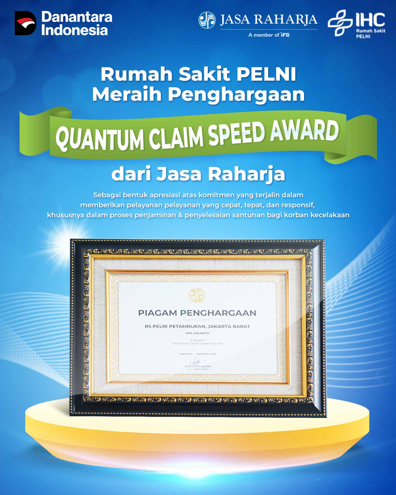 JAKARTA (13/02) – RS PELNI kembali menorehkan prestasi membanggakan dengan menerima penghargaan “Quantum Claim Speed Award” dari PT Jasa Raharja Cabang Jakarta Barat. Penghargaan ini merupakan apresiasi atas keunggulan RS PELNI dalam memberikan pelayanan yang cepat, tepat, dan responsif, khususnya dalam proses penjaminan bagi korban kecelakaan. Penghargaan diserahkan langsung oleh Kepala PT Jasa Raharja Cabang Jakarta Barat, Bapak Syafaat Rahman, kepada Direktur RS PELNI, dr. Laili Fathiyah, MPH, FISQua. Pencapaian ini merupakan bukti nyata sinergi kuat antara RS PELNI dan PT Jasa Raharja dalam memprioritaskan keselamatan dan kemudahan administrasi bagi pasien. Dengan penghargaan ini, RS PELNI berkomitmen untuk terus meningkatkan standar layanan demi kesembuhan dan kenyamanan seluruh masyarakat.