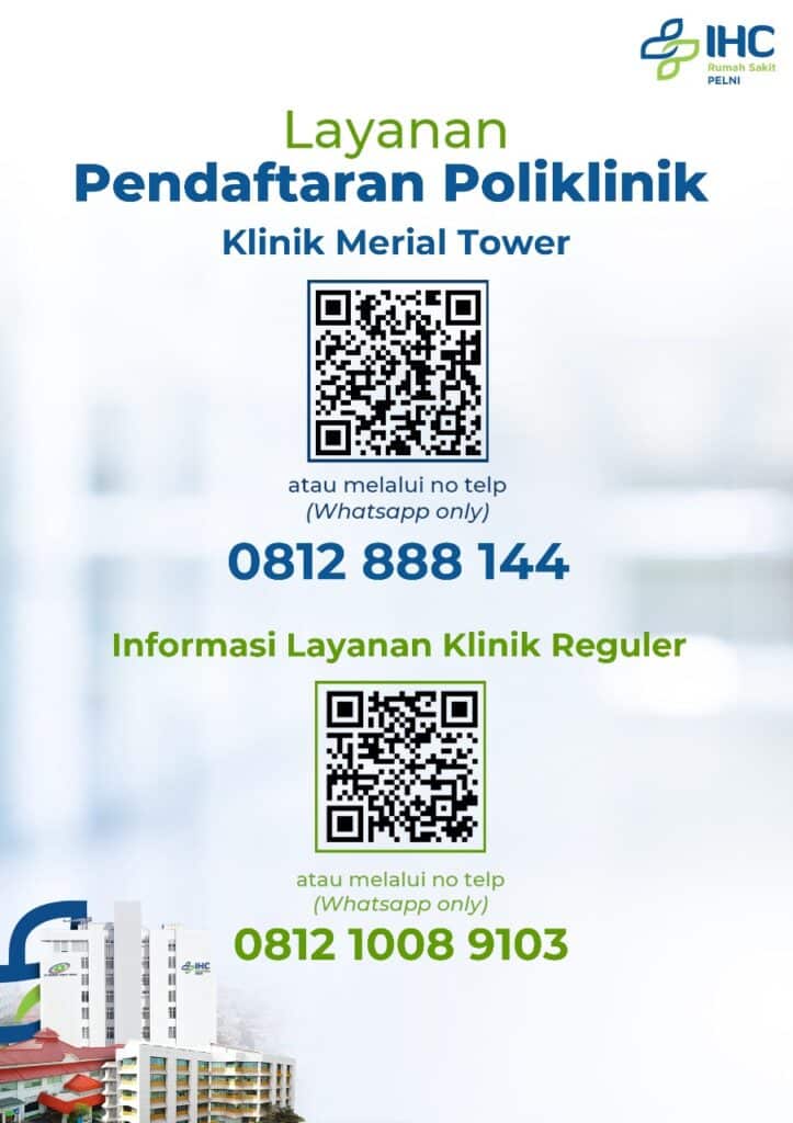 Untuk pendaftaran saat ini bisa melalui WA Chat BOT RS PELNI Pendaftaran Klinik Eksekutif MERIAL / Non BPJS / BPJS Top Up : 62812888144 Pendaftaran Pasien BPJS : Melalui Mobile JKN Informasi Layanan BPJS : 6281210089103