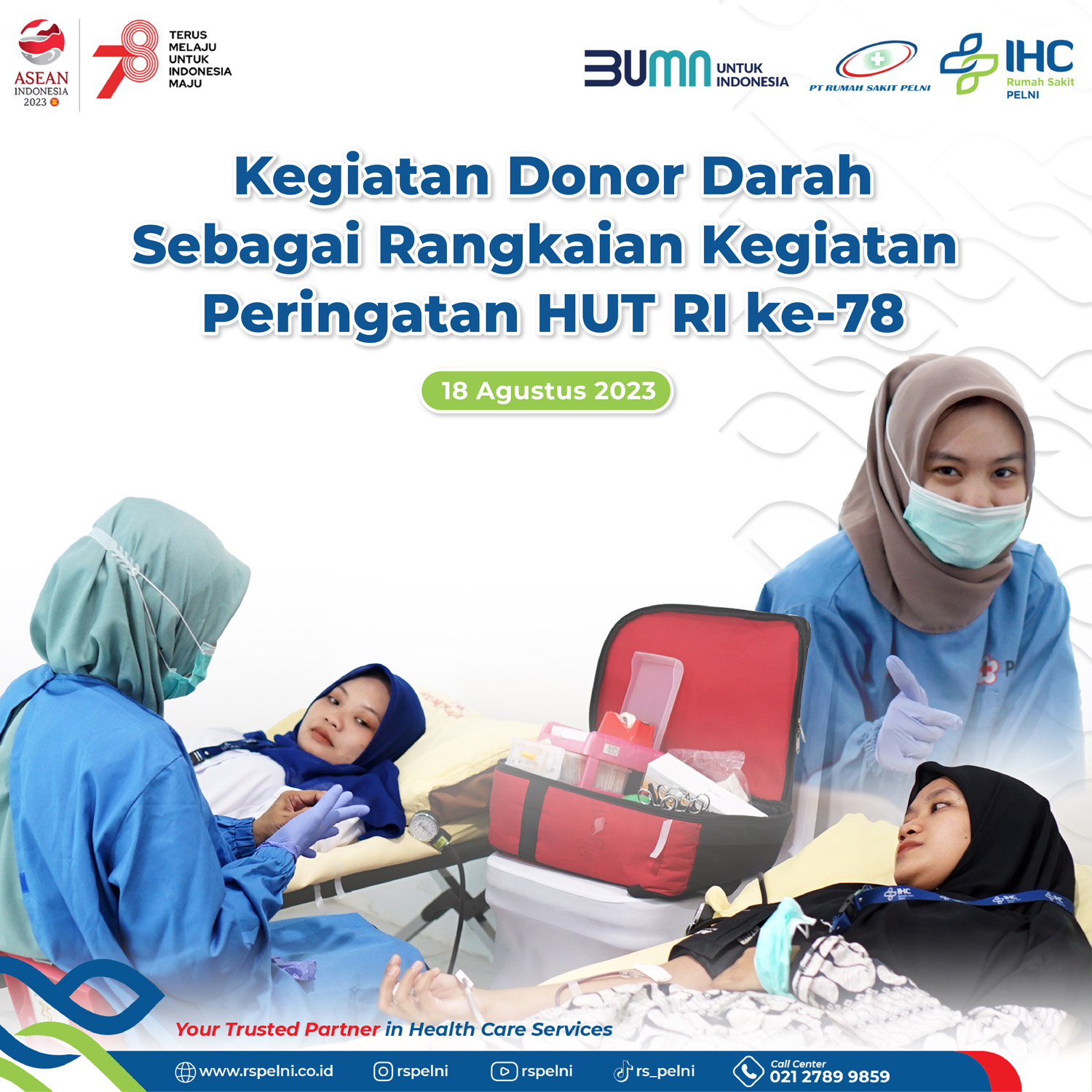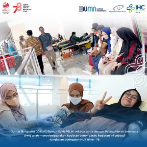 Jumat 18 Agustus 2023 kegiatan donor darah yang diselenggarakan di PT Rumah Sakit PELNI sebagai rangkaian kegiatan 17 agustus 2023 . kegiatan ini diperuntukan untuk umum, dan seluruh karyawan PT RS PELNI. Donor darah yang dilaksanakan selama 2 jam dan berhasil mengumpulkan hingga 102 peserta dengan yang berhasil donor 83 kantong, dimana kegiatan ini berlokasi di lt 2 gd merial Tower RS PELNI. Melalui kegiatan ini PT RS PELNI berharap dapat memberikan manfaat kepada banyak orang yang sedang membutuhkan donor darah.