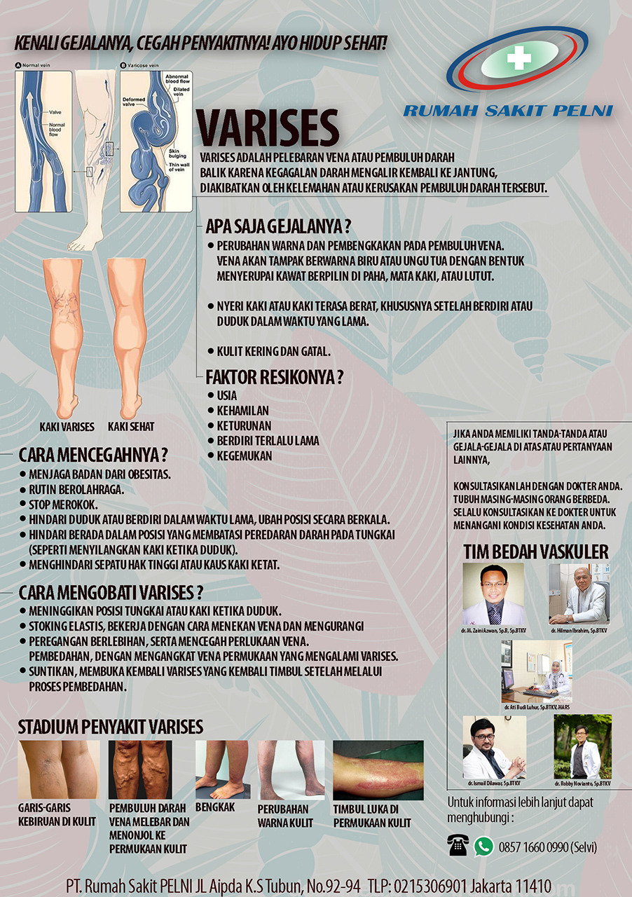 Semangat pagi teman terbaik Rumah Sakit PELNI. Libur hari raya telah usai, kini saatnya kita kembali beraktivitas. Saat menjalankan libur Hari raya yang lalu tentu saja banyak dari sahabat Rumah Sakit PELNI yang lupa akan kebiasaan baik bagi tubuh seperti Lupa berolahraga, mengkonsumsi makanan tinggi lemak, hingga tentu saat Hari raya kita sangat banyak berkatifitas (berjalan, beridiri terlalu lama) saat bersilaturahmi. Tahukah kalian pola hidup tersebut bukan saja dapat menimbulkan penumpukan lemak dan kadar gula darah dalam tubuh. Tetapi ada ancaman kesehatan lain yang bisa saja timbul karena pola aktivitas selama liburan tersebut, salah satunya Adalah Varises. Varises adalah kondisi pelebaran vena atau pembuluh darah balik karena adanya kegagalan darah mengalir kembali ke jantung yang diakibatkan kelemahan atau kerusakan pembuluh darah tersebut. Mari baca sedikit informasi diatas mengenai ciri-ciri hingga faktor resiko terjadinya varises serta informasi Rujukan dokter-dokter yang dapat anda tuju saat ciri-ciri tersebut anda temukan.